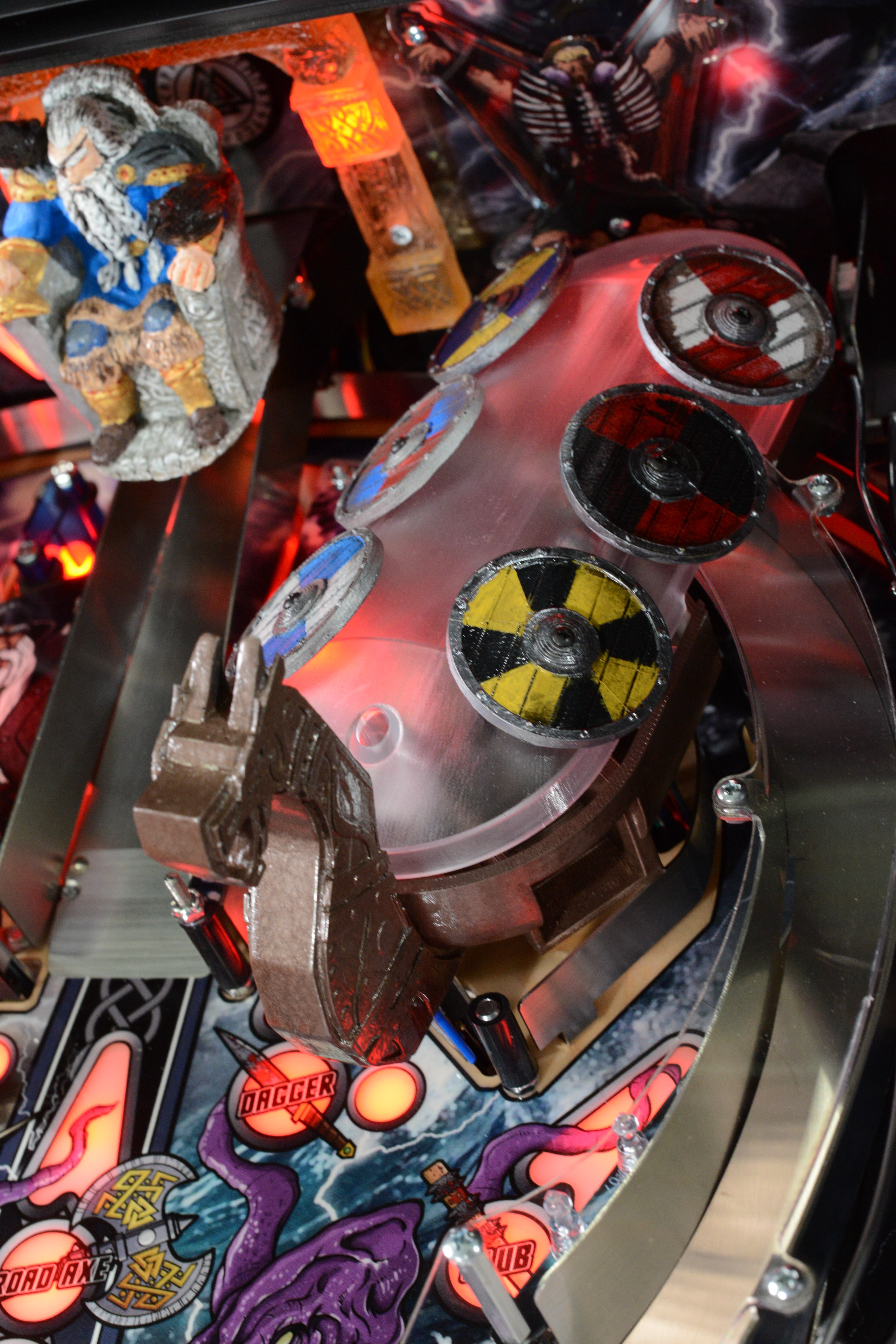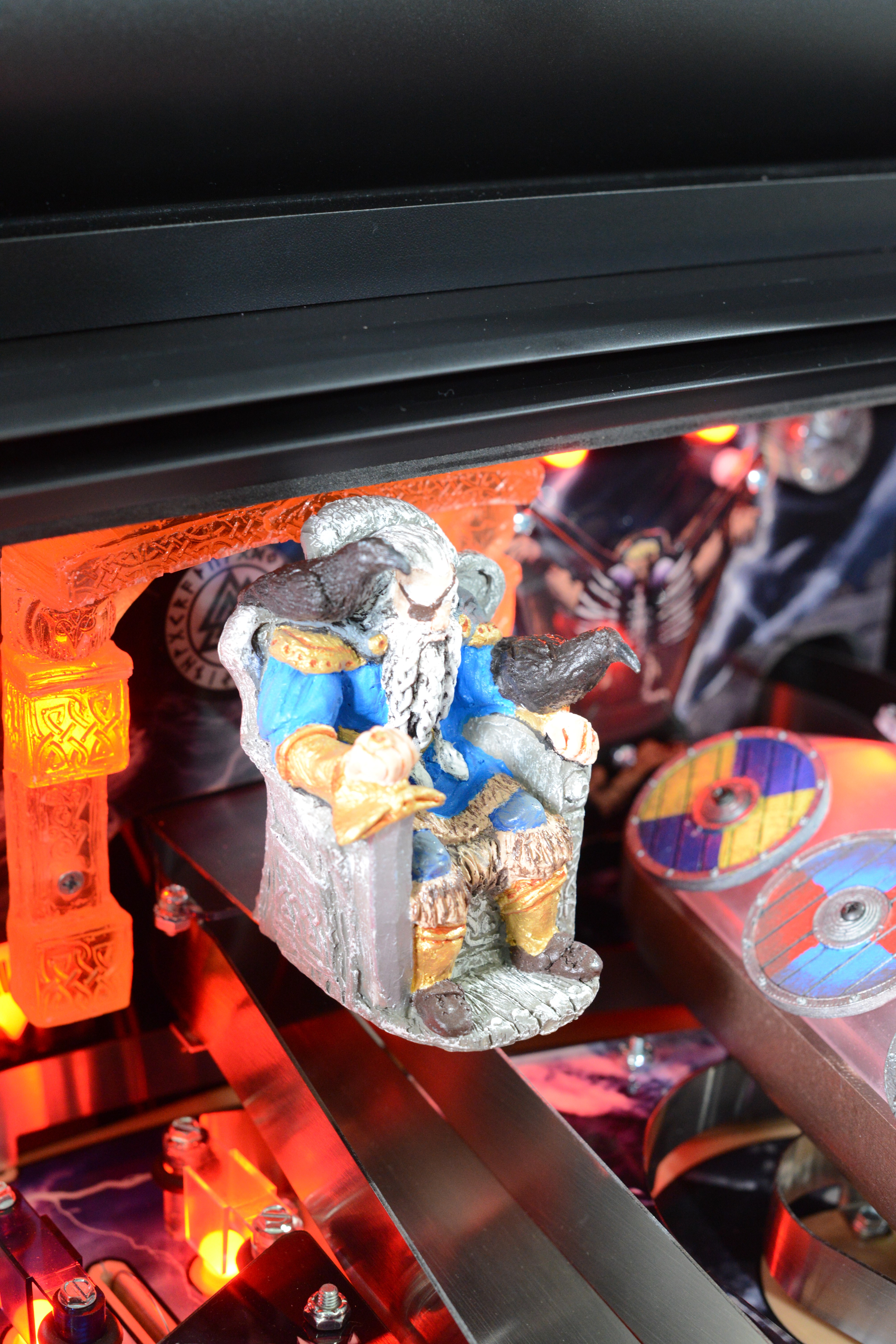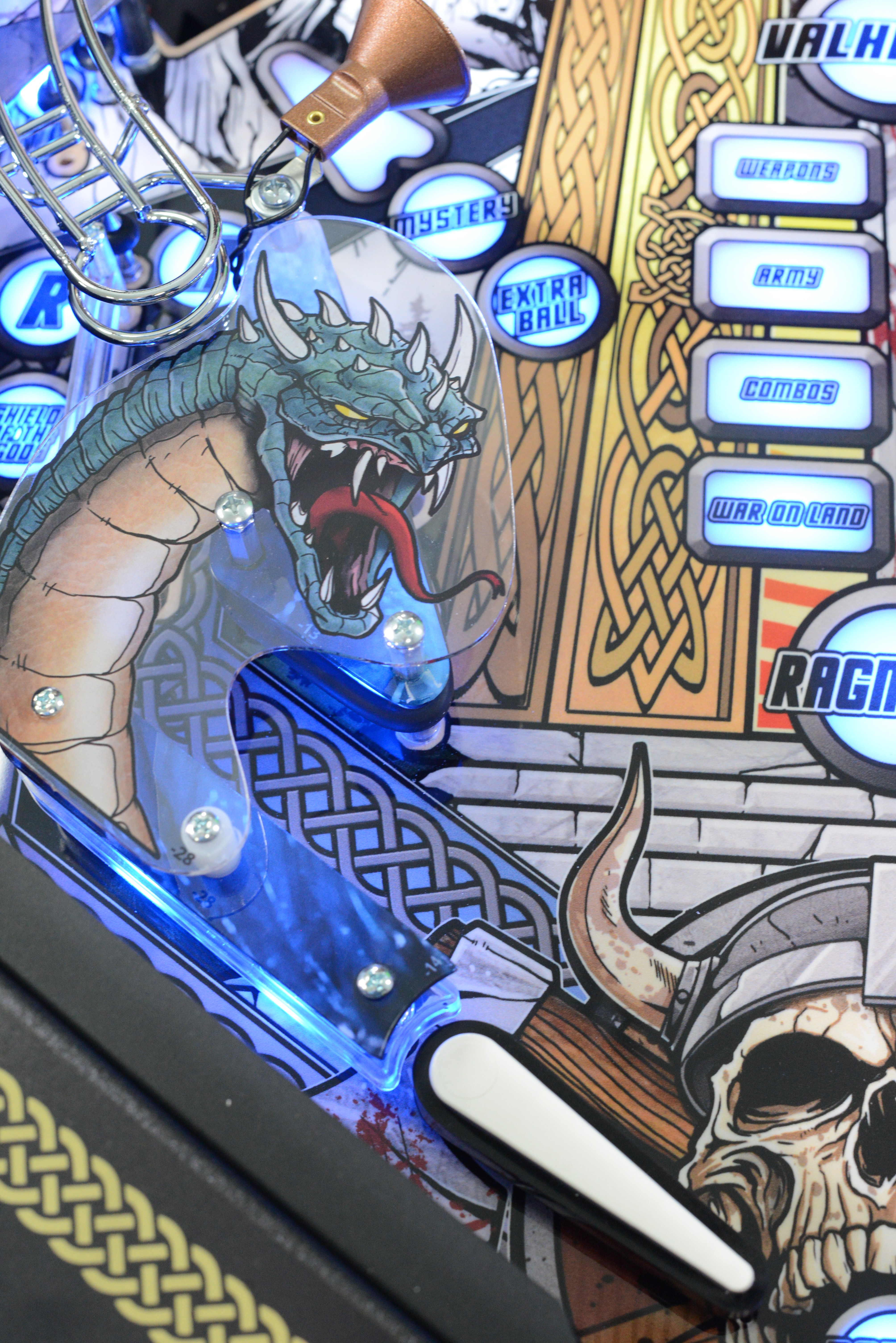 The game also exhibits a couple of fun playfield features such as the Kraken, which grabs the ball via a hidden magnet mounted underneath the playfield and flings it around in chaos. Also featured is a Viking ship where the player builds their army by locking balls inside to begin multiball play. Additionally, Thor's hammer, which is mounted on the back panel and activated by a 3rd flipper button, comes crashing down onto the ball which is held by a magnet just over the top lanes, simulating a dramatic lightning strike, adding to the gameplay experience.